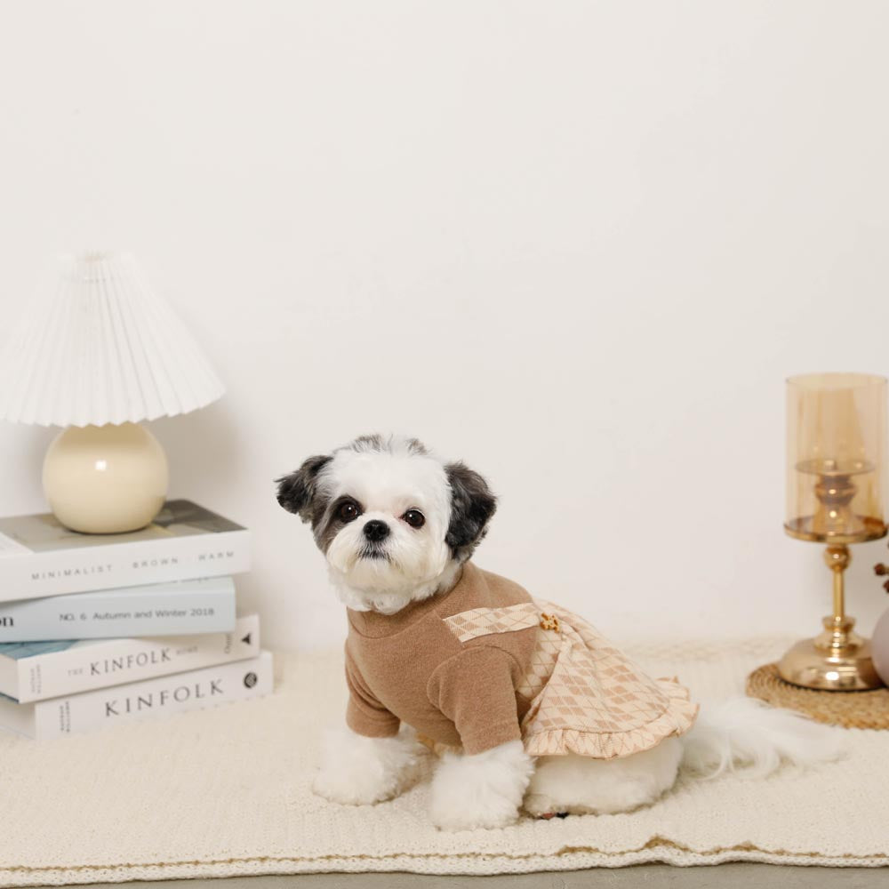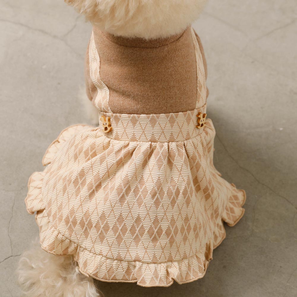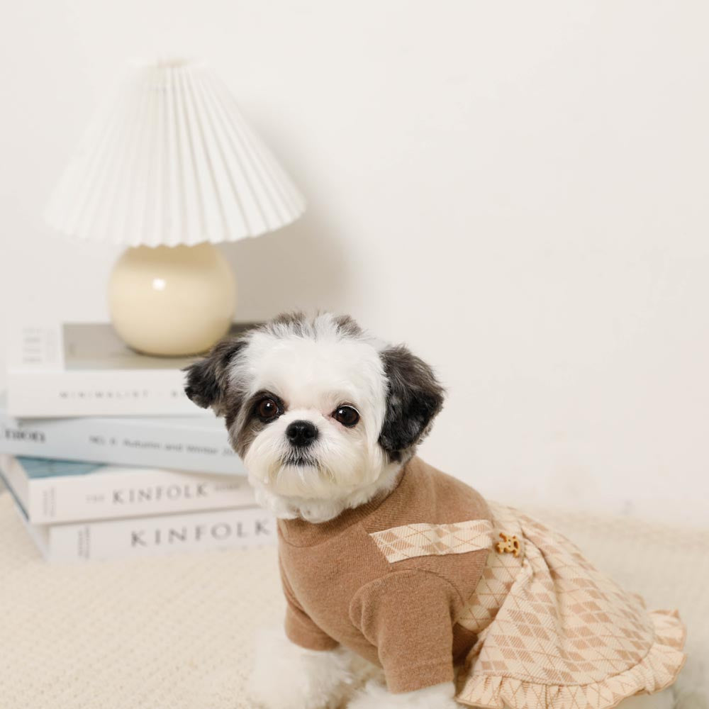 This adorable outfit features a soft, stretchy knit beige top paired with an argyle-patterned dress, creating a stylish and comfortable look for your dog. The cute wooden horse-shaped buttons add a charming touch that’s sure to catch the attention of other pups!