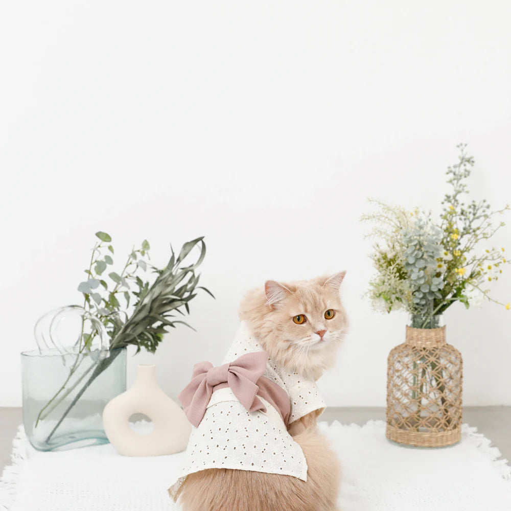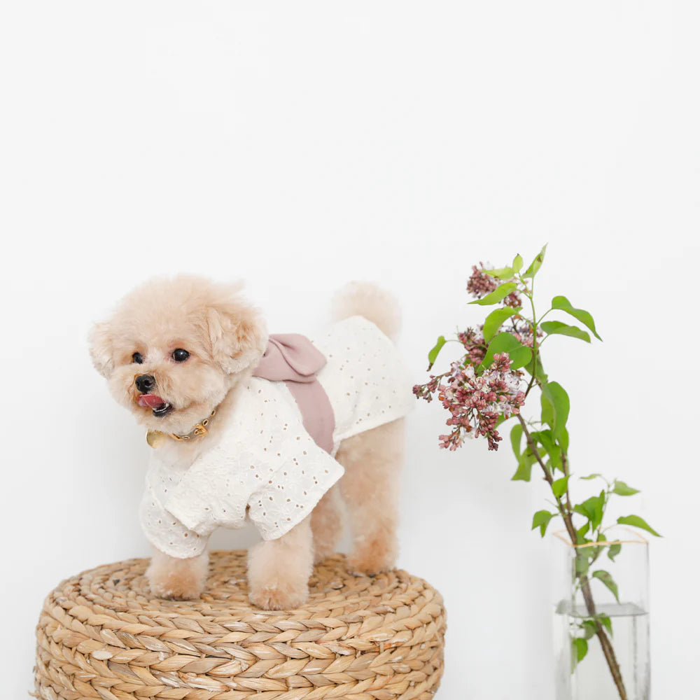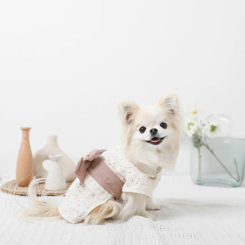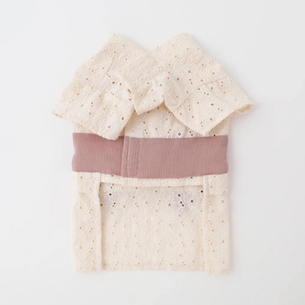 Introducing monchéri ivory flower yukata in a charming ivory hue, radiating a natural and delicate atmosphere. The flower pattern crafted from cut work lace adds a sweet, feminine touch, making it the perfect choice for any girl dog. The soft pink obi ribbon further enhances its adorable appeal.