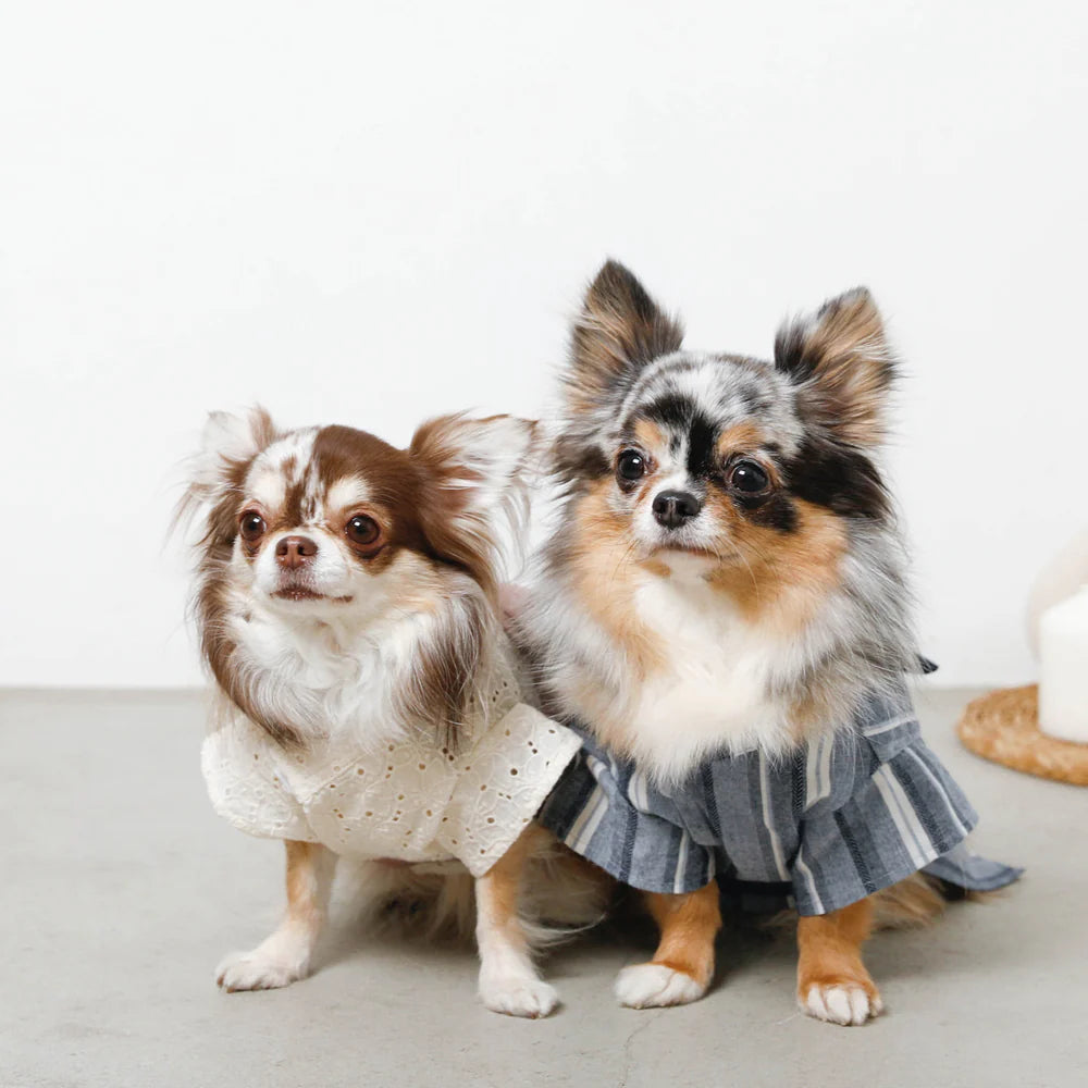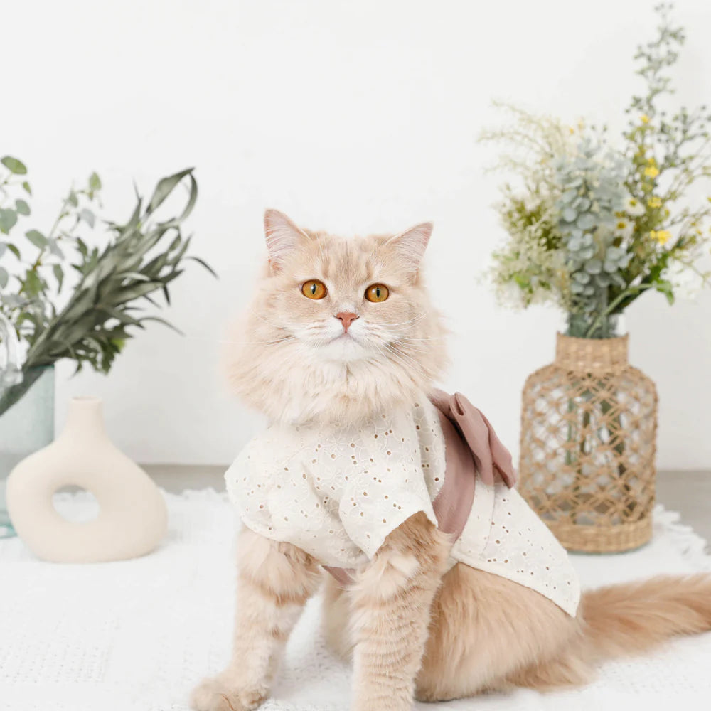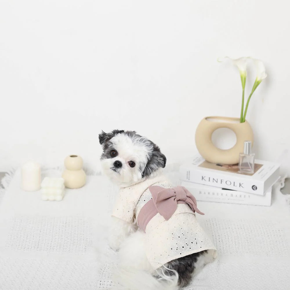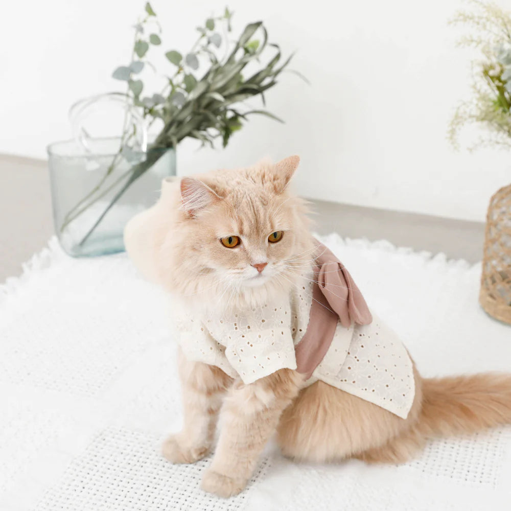 Introducing monchéri ivory flower yukata in a charming ivory hue, radiating a natural and delicate atmosphere. The flower pattern crafted from cut work lace adds a sweet, feminine touch, making it the perfect choice for any girl dog. The soft pink obi ribbon further enhances its adorable appeal.