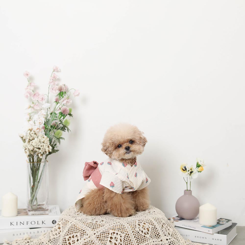 Introducing monchéri strawberry watercolour yukata, crafted from soft ivory fabric adorned with a charming strawberry print.