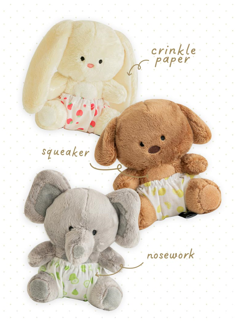 Introducing "My Little Animal Friends," the ultimate companions for your beloved fur kids! With absolutely adorable elephant, puppy, and rabbit designs, these toys are bound to bring endless joy. Equipped with playful squeakers and crinkly ears, they provide interactive fun for your pets. What sets these toys apart is the underpants removal feature, allowing you to hide treats inside, turning playtime into a thrilling treat-discovery journey. Watch as your furry friends engage their instincts and intelligence to reveal the hidden surprises, keeping them mentally stimulated and entertained. "My Little Animal Friends" are not just toys; they are loyal playmates that will bring happiness and excitement to your pet's life.